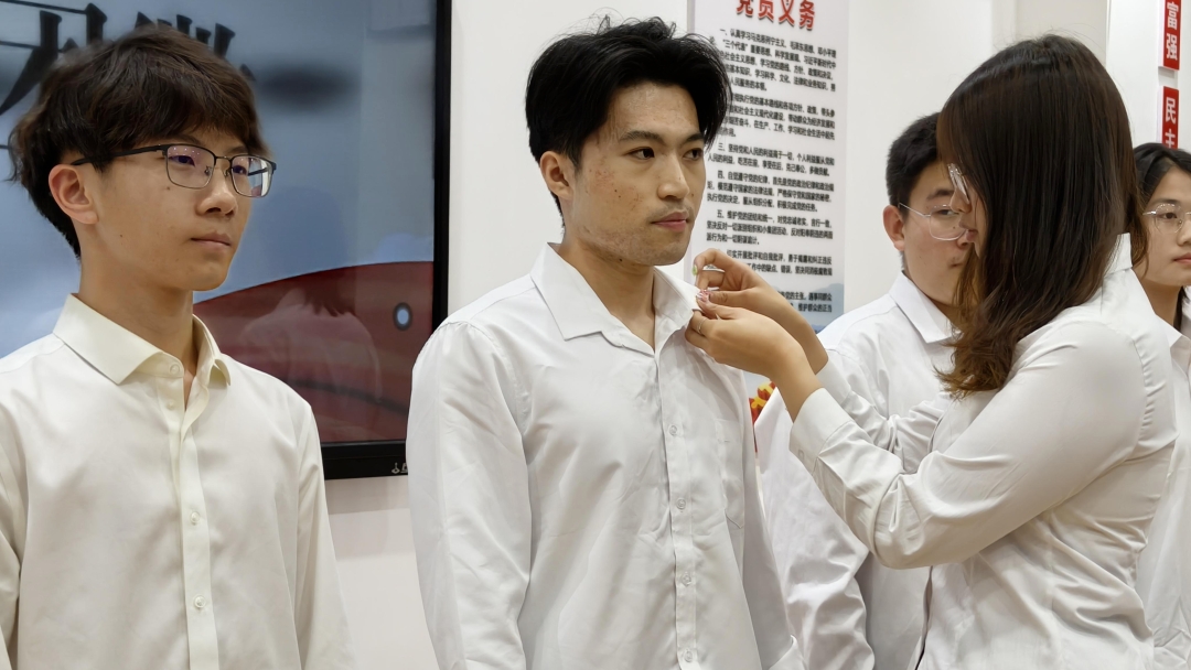 佩戴团徽环节,承载着共青团精神的传承。学院组织部人员庄重地为新团员佩戴团徽,一枚枚熠熠生辉的团徽别上胸前,不仅是身份的象征,更凝聚着共青团员的光荣与使命。新团员们抚摸着胸前的团徽,目光中满是坚定,这一刻,信仰的力量在无声中传递。