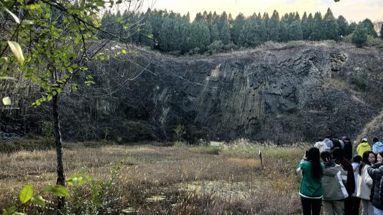 随后,师生前往昌乐远古火山口。在这处玄武岩火山遗迹前,专业老师详解郯庐断裂带活动与火山喷发的关联,指导学生识别辐射状柱状节理等典型火山岩特征。带队教师元伟涛强调,地质实习是专业人才培养的重要环节,此次实习帮助学生掌握野外勘察基本技能,提升分析工程地质问题的能力。