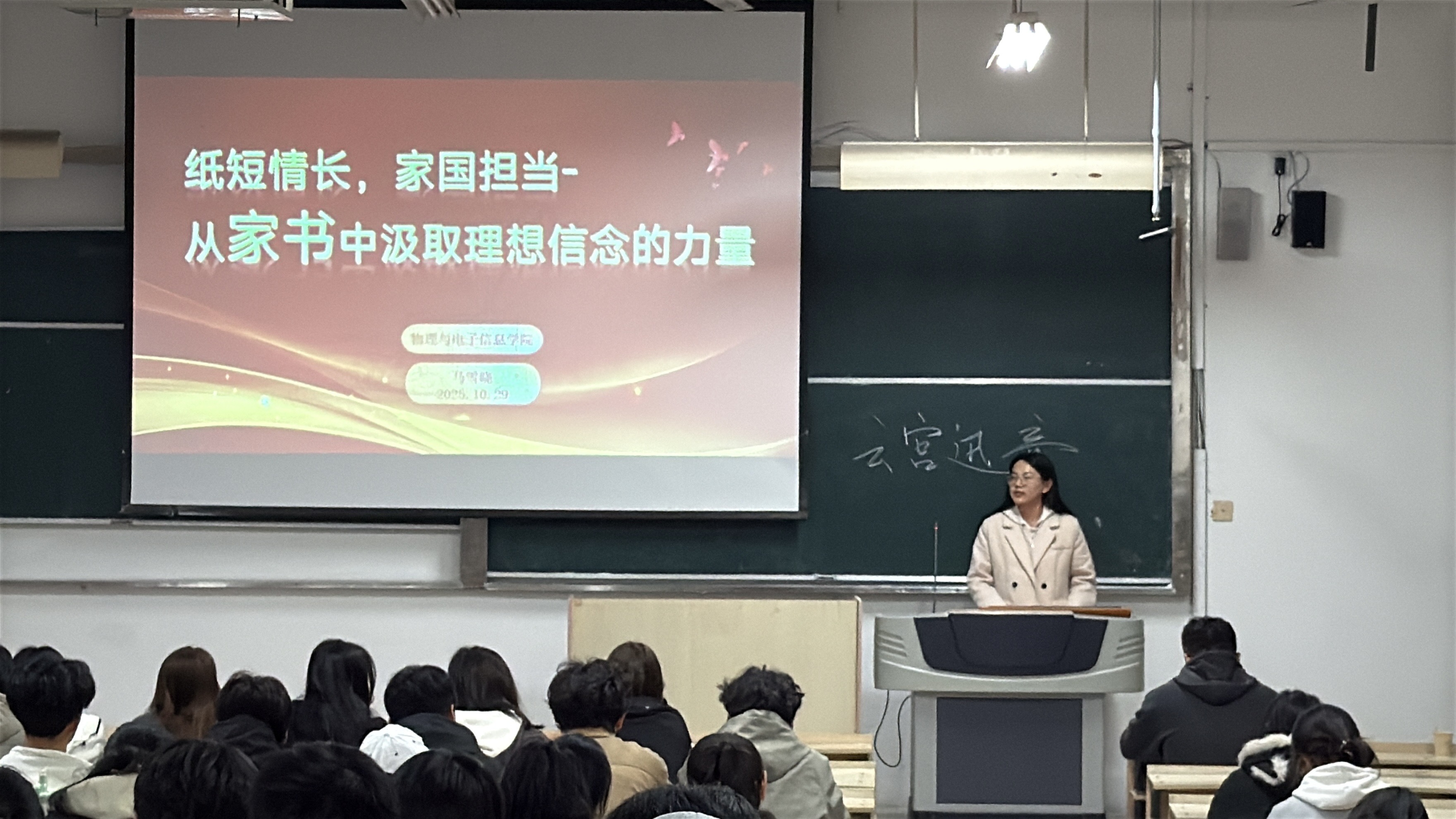 为帮助新生快速适应大学生活,明确成长方向,10月29日,“理想铸魂・榜样引路”宣讲团来到我院,在6102教室为2025级同学带来关于理想信念的宣讲活动。物理与电子信息学院马雪晓老师、文史学院辛世昌老师、物理与电子信息学院的刘晓雯同学主讲,土木与交通学院2025级全体新生参与。