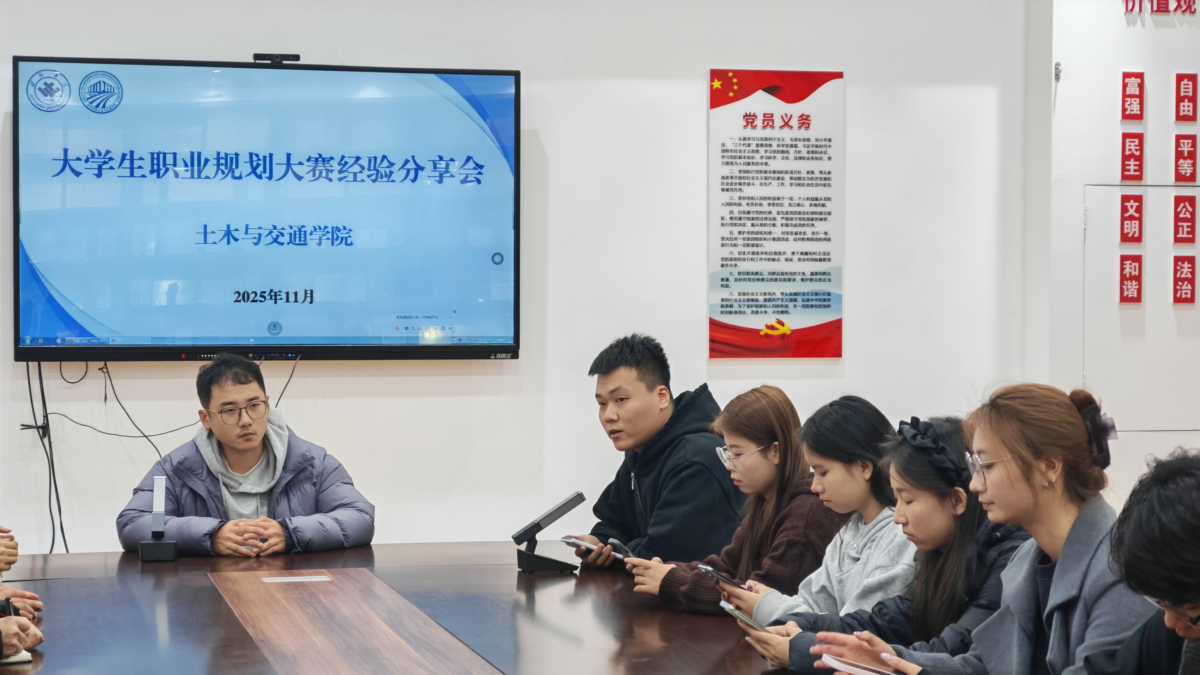 11月12日,土木与交通学院在6104教室举办大学生职业生涯规划大赛经验分享活动。辅导员杨宗祎主持,2025级工程管理专业宣青山同学主讲,各班级学生代表参加。