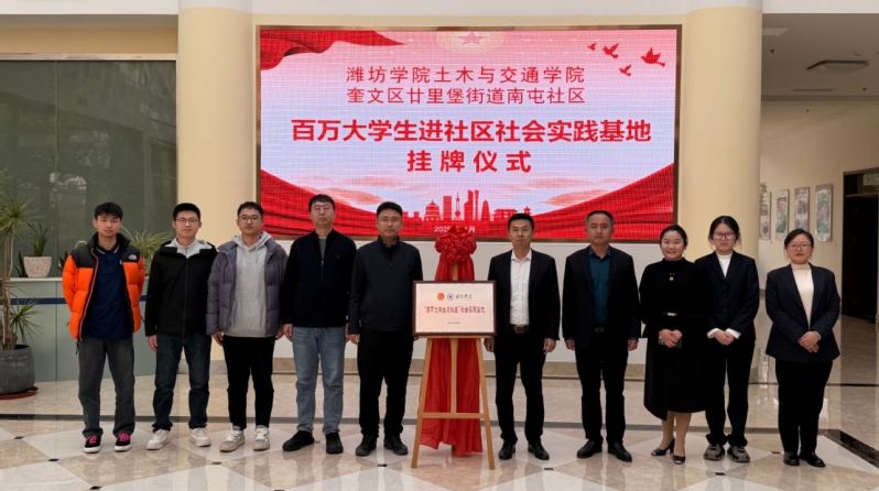 为深入贯彻落实“百万大学生进社区”行动部署,促进基层治理与高校的深度交融,11月15日,土木与交通院与奎文区甘里堡街道南屯社区共建社会实践基地挂牌仪式在南屯社区党群服务中心顺利举行。这一重要举措,标志着校社携手、资源共享、服务民生的合作开启全新篇章。