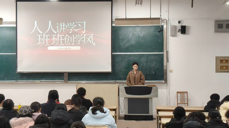2025年11月23日,土木与交通学院在致远楼6102教室举办“人人讲学习,班班创学风”主题班会,2025级全体学生参与。本次班会以“示范引领明方向、交流互助浓学风”为核心目标,通过成果展示、互动研讨、经验分享等环节,为学生搭建学习交流平台,引导大家明确学业规划,营造勤学善思、互助共进的班级氛围。