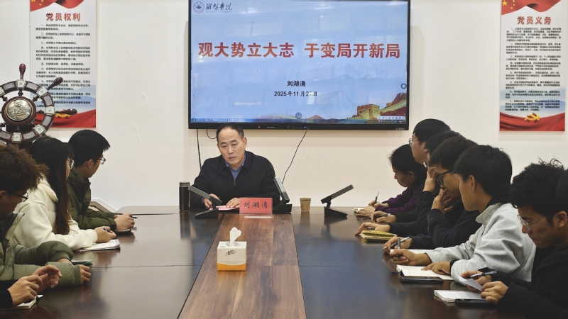 刘湖清首先分析了当前国际形势及青年一代的责任使命。他指出,当下的国际格局,正处在“变乱交织”与“共识凝聚”的碰撞中,既充满挑战,更藏着机遇。作为当代大学生要把专业所长与时代需求相连。随后刘湖清对大三同学们深情寄语,一是要把专业学深学透,于坚守中成就自我。二是多关注国家科技领域需求,结合自身专业明确未来深耕方向。三是把个人理想融入国家发展,贡献青春力量。