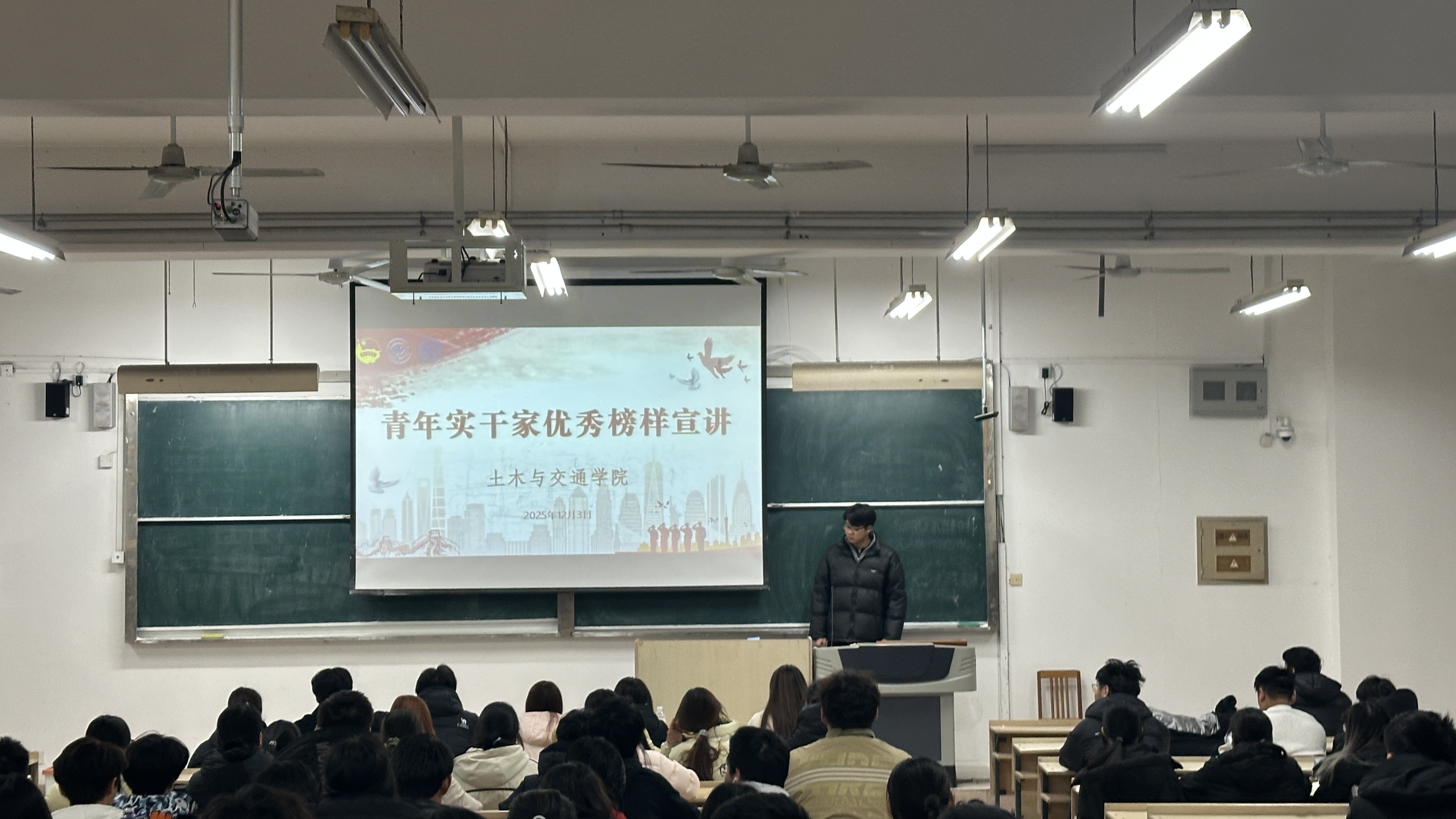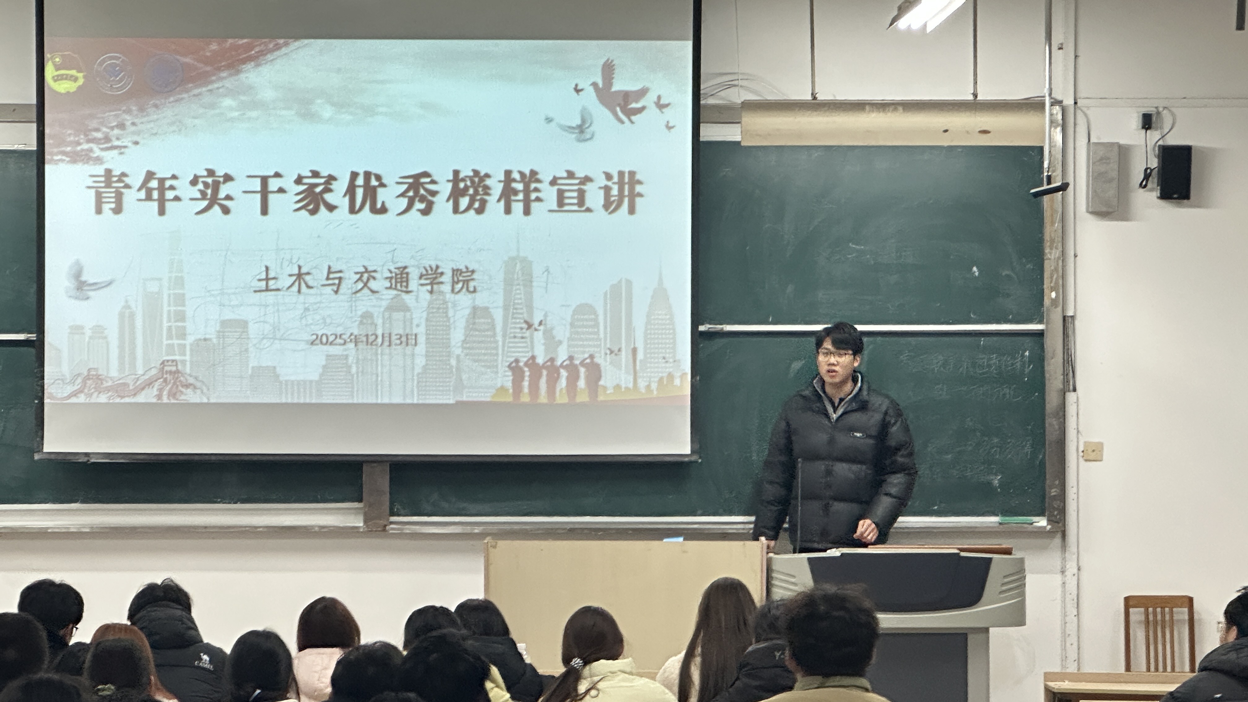 为帮助2025级新生树立正确的价值观,做好大学成长初期的基础准备,引导新生积极向优秀榜样学习、汲取奋进力量,土木与交通学院于12月3日晚,在致远楼6102教室举办了以“青春奋斗、实干担当”为主题的青年实干家优秀榜样宣讲会,2024级工程管理专业李金泽主讲,2025级全体新生参加。