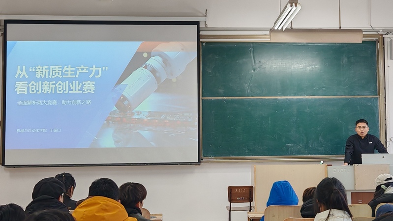 会议伊始,于振山强调新质生产力已成为当前创新创业赛事的重要导向,鼓励学生把握这一关键趋势,积极投身高质量创新实践。随后,他系统介绍了中国国际大学生创新大赛、挑战杯等赛事的基本框架,国家级、省级奖项的评定已向技术硬实力倾斜,明确指出“新质生产力”是当前评审的核心标准,这些赛事经历不仅是考研就业的“硬通货”,更是个人创新能力提升的重要台阶。