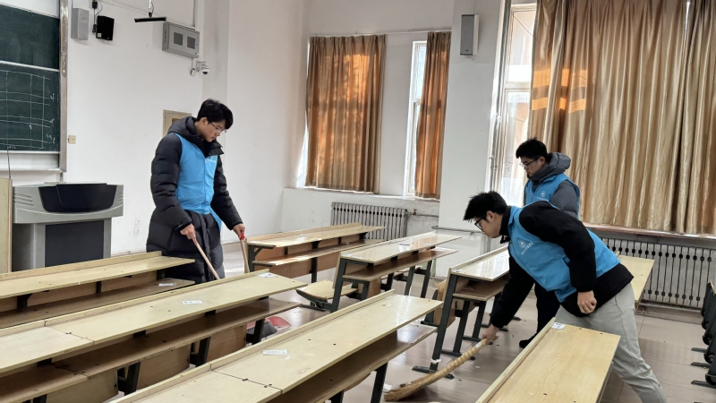活动前,志愿者们分组明确任务区域与清洁标准,携带扫帚、抹布、消毒液等工具有序集合。活动中,大家分工协作、干劲十足:一组负责致远楼教室,细致清扫地面杂物、擦拭桌椅与黑板,整理散落的书籍文具;二组专注建筑学专业自管教室,重点清理角落积尘与抽屉杂物,规范摆放绘图工具;三组针对实验室,在专业老师指导下擦拭实验台、整理实验器材,确保清洁过程安全规范。志愿者们不放过任何卫生死角,用认真负责的态度完成每一项清洁任务,劳动身影成为校园里一道亮丽的风景线。
