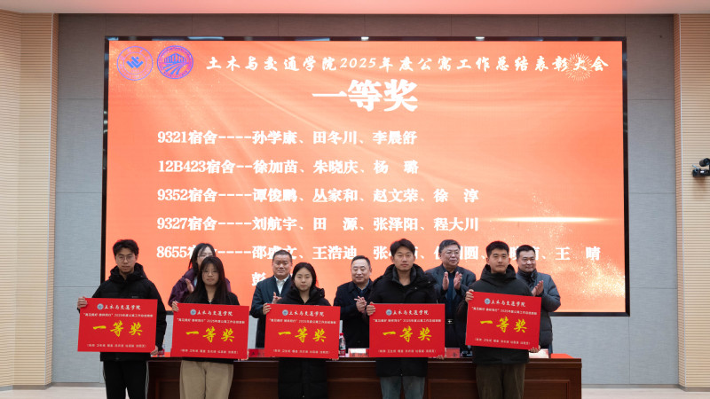 为表彰先进典型,厚植立德树人的宿舍育人沃土,构建整洁和谐、互助共进的优良育人阵地,1月8日,土木与交通学院在4109隆重举行2025年度公寓工作总结表彰大会。学校学生工作部(武装部)部长曹兴波、学院党委书记刘金、学校学生工作有关负责同志、学院各年级学生代表出席大会,会议由学院党委副书记、副院长卢永波主持。