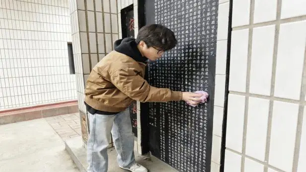在纪念馆工作人员的指引下,韩佳豪领取了扫帚、抹布、垃圾桶等清洁工具,立刻投入到陵园的环境整理工作中。他先仔细擦拭烈士纪念碑,将碑身的浮尘一点点拭去,又拿起扫帚清扫陵园步道两侧的落叶、枯枝与杂物,随后进入纪念馆内,对展柜、展板以及公共区域的桌面、地面进行细致清理。清洁的间隙,他常会停下脚步,认真阅读碑文中的烈士事迹和展板上的文字介绍,字里行间的峥嵘岁月,让他真切感受到先烈们为理想挺身而出的无畏与甘于奉献的赤诚。清理工作结束后,他又主动帮工作人员整理图书角的书籍,将散落的宣传资料分类归置,让场馆的参观环境更整洁有序。交流中,工作人员向他讲述了陵园的建设历程和日常的红色教育工作,也让他对这座纪念馆的意义有了更真切的认识,深刻体会到“纪念”二字背后的历史重量与传承责任。