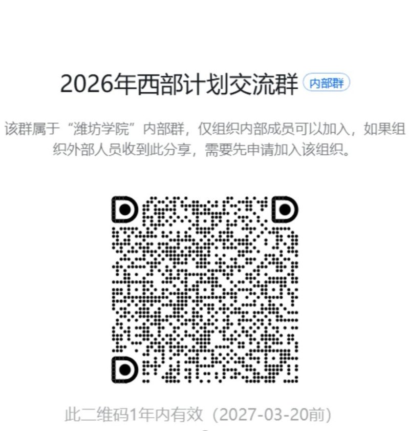 西部计划是由共青团中央、教育部、财政部、人力资源社会保障部联合实施的国家级人才工程,招募普通高校应届毕业生或在读研究生,赴西部基层开展1-3年志愿服务,服务协议一年一签。自实施以来,全国累计超50万名志愿者奔赴基层,潍坊学院也已累计输送300名优秀志愿者,用脚步丈量西部大地,用行动诠释青春担当。