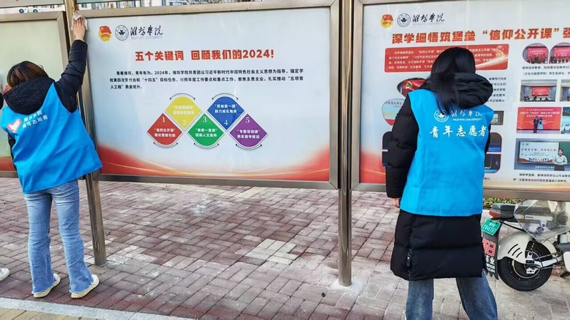 活动当天,班级全体同学身着“青年志愿者”蓝色马甲,分工协作,有的手持抹布仔细擦拭信息栏玻璃与边框,清除积尘与残留胶带;有的认真清理栏边杂物与地面垃圾,还原公共设施整洁面貌;还有的同学结合专业知识,对信息栏布局优化提出小建议,为后续校园公共视觉设计积累实践素材。在近两个小时的劳动中,同学们热情高涨、配合默契,原本蒙尘的信息栏焕然一新,周边环境也变得更加整洁有序。
